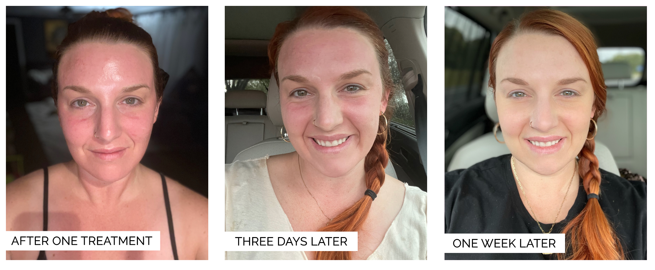 Stevye reports no downtime at all, but says her face was “red and felt sunburnt for a few days. My skin was a bit flaky, too, but it was minor.” In all, the procedure took about an hour—30 minutes for numbing and 30 minutes for microneedling and post-procedure cleansing. In addition, she says Aimee’s warmth and professionalism were top-notch, claiming, “Aimee made me feel extremely comfortable and even turned on the bed warmer for me! She checked in on me throughout the procedure and we had a good conversation.”