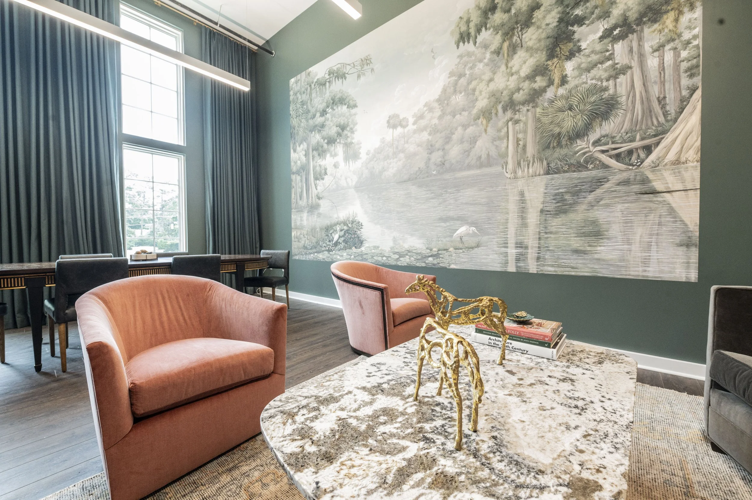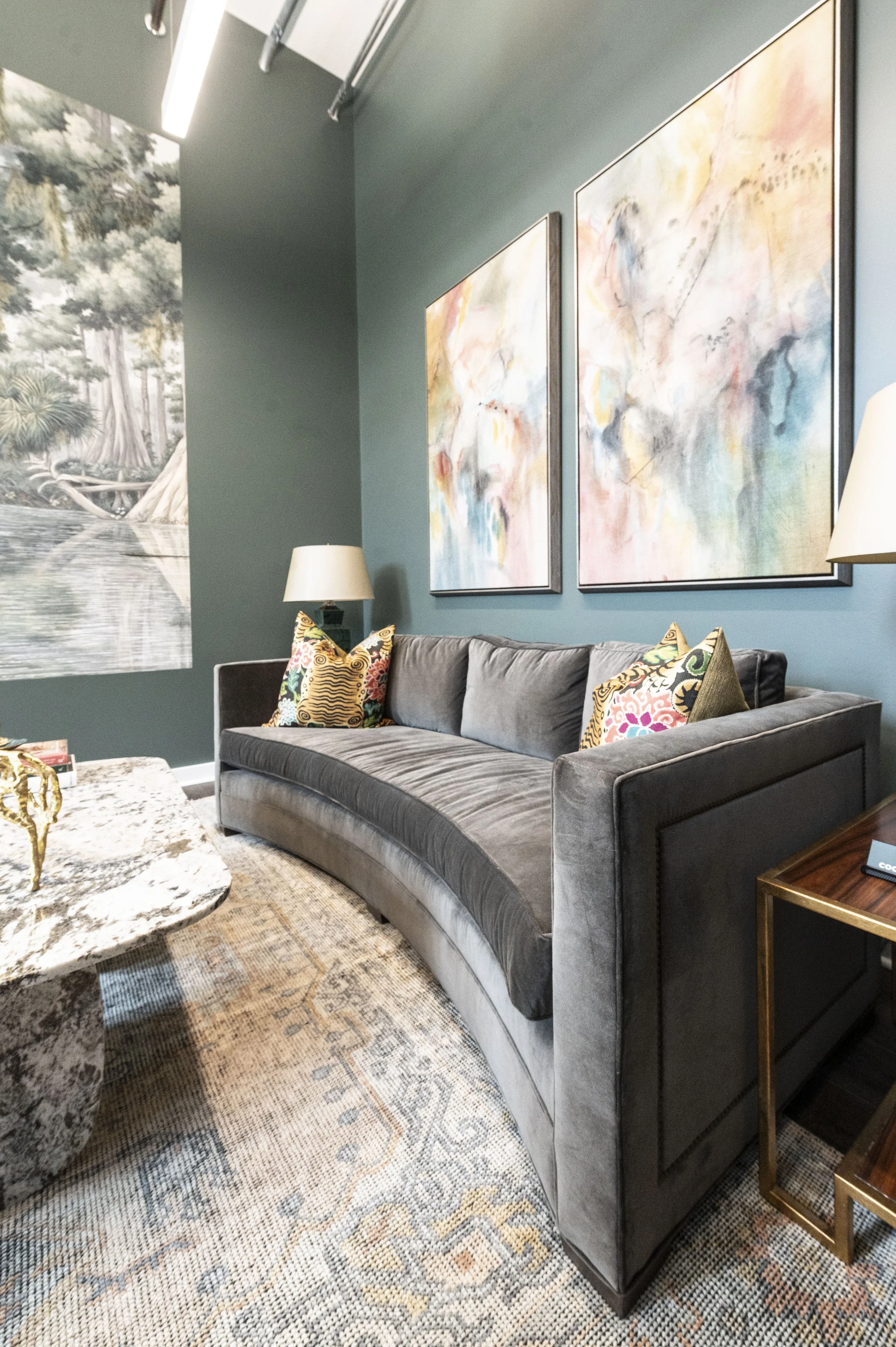 Getting to the point, their new office in downtown Fairhope in the prestigious Portico building is the last thing we expected. Much to our surprise we walked into a beautiful space with high ceilings dripping with drapes we dream of, walls painted to perfection in a timeless matte dark green, a spectacular mural, a grand table we’d like to have for a dinner party, and high-end furnishings, art, and decorative items that spoke to us.