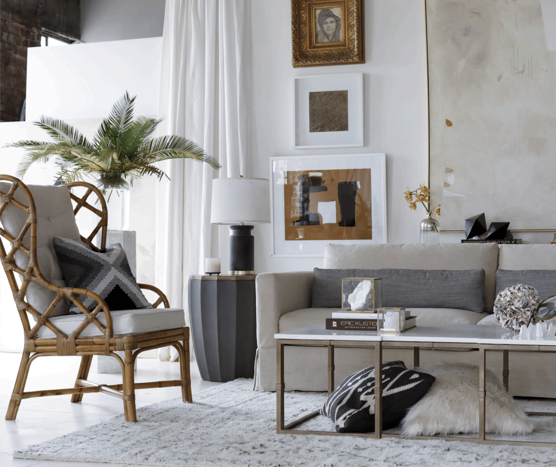 As for the natural elements, Tim suggests folding in rattan, bamboo, and distressed wood; greenery such as palm fronds, elephant ear, and fig leaves that provide the perfect nod to mid-century modern design; and even untreated stone and unpol-ished metal. “A few natural elements are all that’s needed to add instant warmth to any room while still looking chic and modern,” he details. “When looking at wooden pieces, lighter shades like oak are best, as darker shades can soak up all the light in a room and look too heavy and dated,” he adds. More specifically, consider lighting made from natural materials in timeless silhouettes with grand scale for a more casual — but no less classic — feel. Pieces made withcoconut beads, abaca rope, and bamboo offer a more relaxed spirit but are now viewed as contemporary and are perfect for all spaces from the dining room to the breakfast nook. Update heavy side tables with airy modern options with white marble tops and metal bases, or try adding a woven bench or dining room chairs to refresh formal spaces. Lastly, simply adding a green accent wall or even just a bit of greenery to a room will do wonders, all while bringing the joys of the great outdoors into your home.