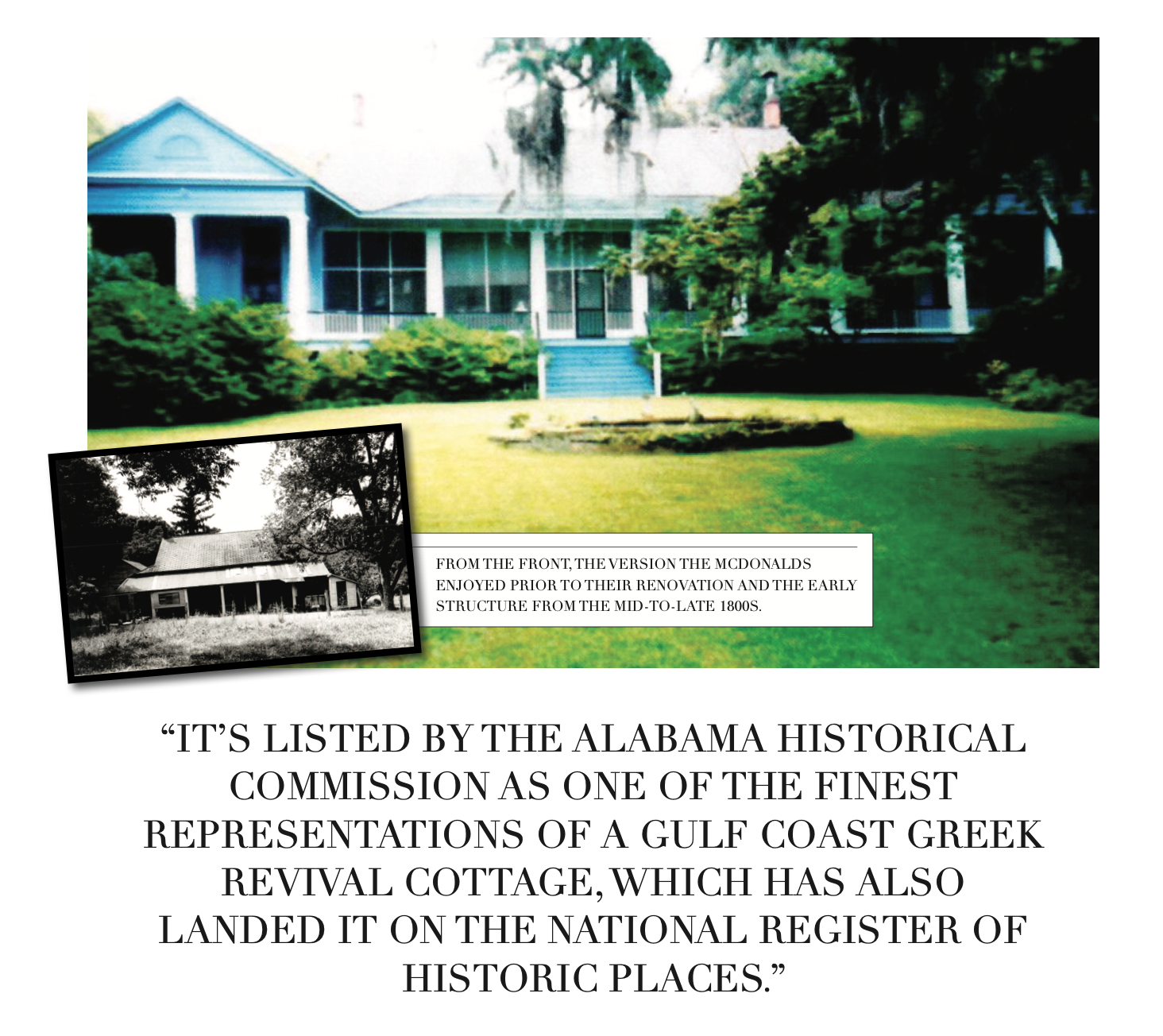With its fascinating past, attention to every detail is being considered in the name of preservation. Now referred to as the Cullum-Lea-Caffey home, the exact date of its origin is fuzzy but experts place it around 1846 and confirm it to be one of the oldest homes in the area. It’s listed by the Alabama Historical Commission as one of the finest representations of a Gulf Coast Greek Revival cottage, which has also landed it on the National Register of Historic Places. The name is a combination of the few families that have called it home over time.